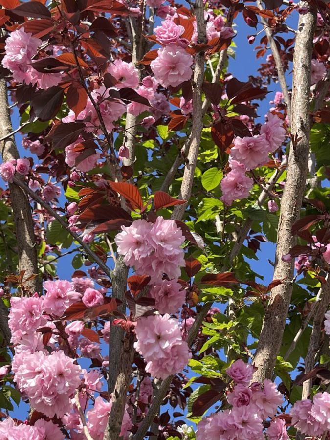 Besonders schön ist die japanische Zierkirsche mit ihren vielen rosa Blüten. Wenn die Sonne scheint, leuchten die Blüten besonders toll und verwandeln Teile des Schulhofs in ein kleines Blütenmeer.