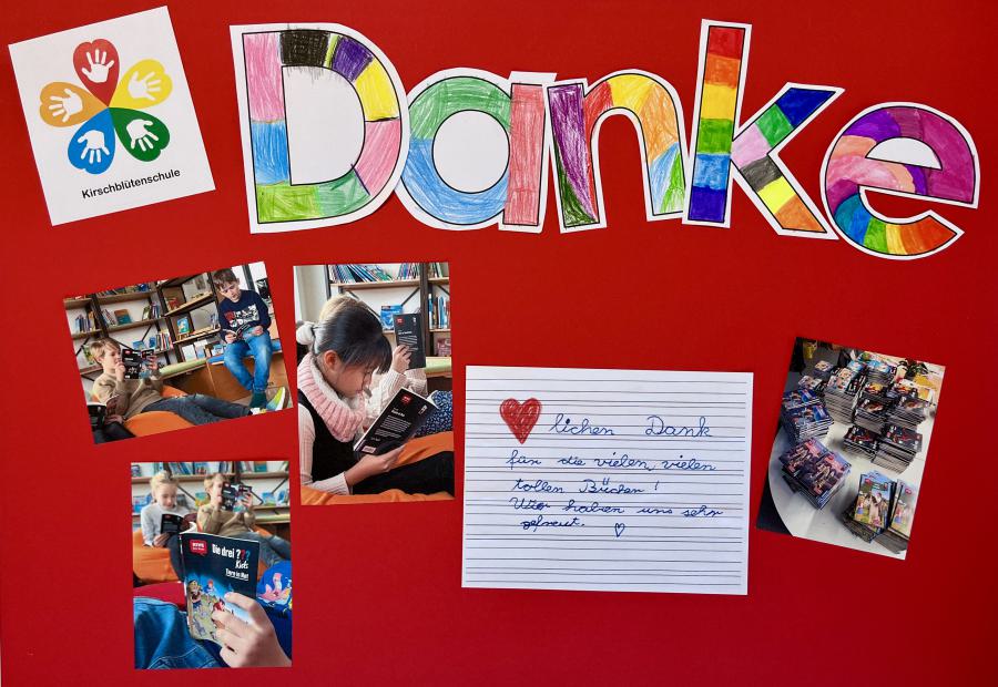 Das Team von Rewe Azhari unterstütze die Schule hervorragend und so konnten alle Kunden, die ihre Bücher nicht brauchten, diese in eine vorbereite Box für die Schulkinder legen. Auf diesem Wege kam die unglaubliche Summe von über 650 Büchern zusammen. Nun hat die Schule 9 verschiedene Klassensätze der „Drei Fragezeichen“, sowie der „Drei Ausrufezeichen“.