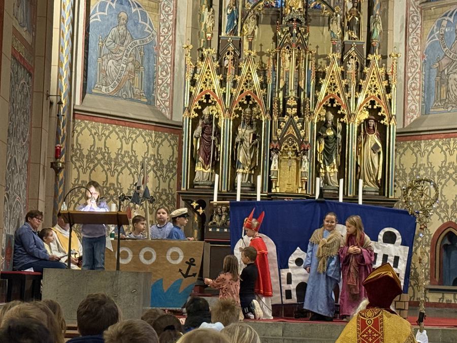 Die Klasse 2b hatte den Gottesdienst gemeinsam mit ihrer Klassenlehrerin vorbereitet. Die Kinder der Klasse erklärten in sehr anschaulicher Art und Weise, welche besonderen Kleidungsstücke der Bischof Nikolaus trägt. Anschließend spielten sie in einem kleinen Theaterspiel die Szene des Kornwunders aus dem Leben des Bischofs Nikolaus nach. Die liebevoll vorbereitete Darstellung wurde mit viel Applaus belohnt.