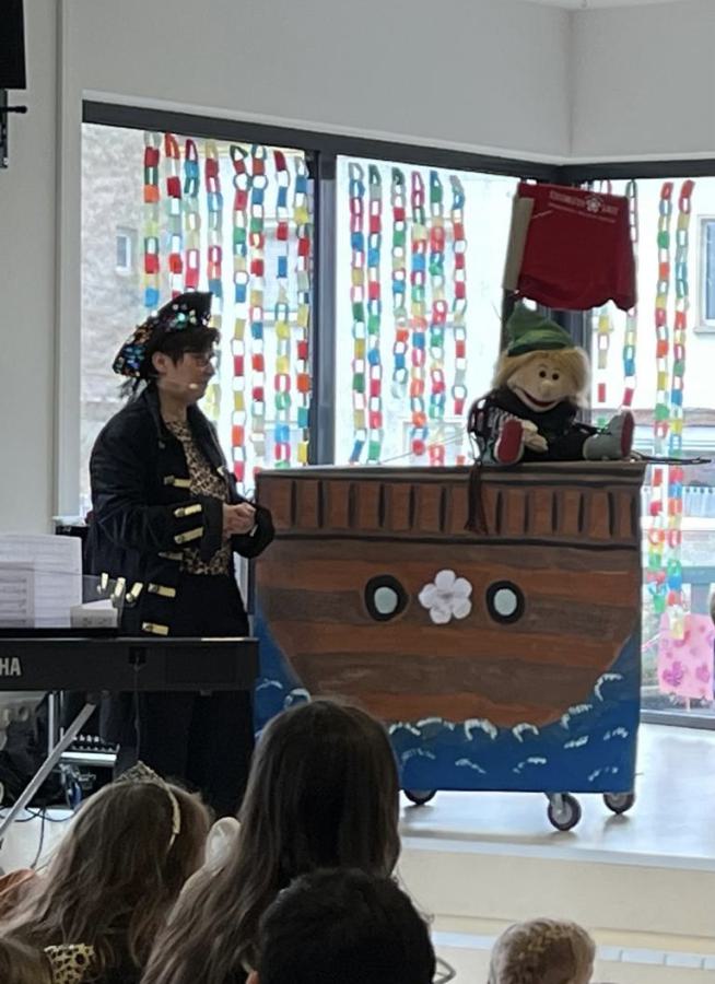 Im Anschluss fand die gemeinsame Feier im Mehrzweckraum statt. Insgesamt 270 Schülerinnen und Schüler kamen dort zusammen, um ein buntes Programm zu erleben. Durch die Veranstaltung führten Piratin Claudia Seidel mit Peter Pan – stilecht von ihrem Piratenschiff aus. Mit viel Humor und guter Laune begleiteten sie die Beiträge der Klassen.